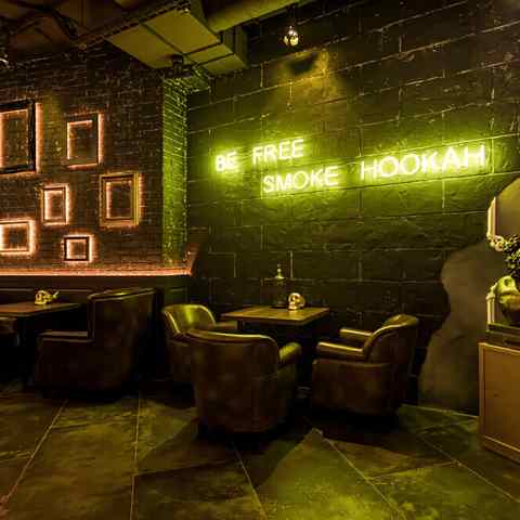 В интерьере можно заметить и современные черты: кожаные комфортные диваны, неоновые надписи, игровая зона с экранами и PlayStation 5. Рядом есть парковка. Сама кальянная находится в центре города, в районе площади Победы.